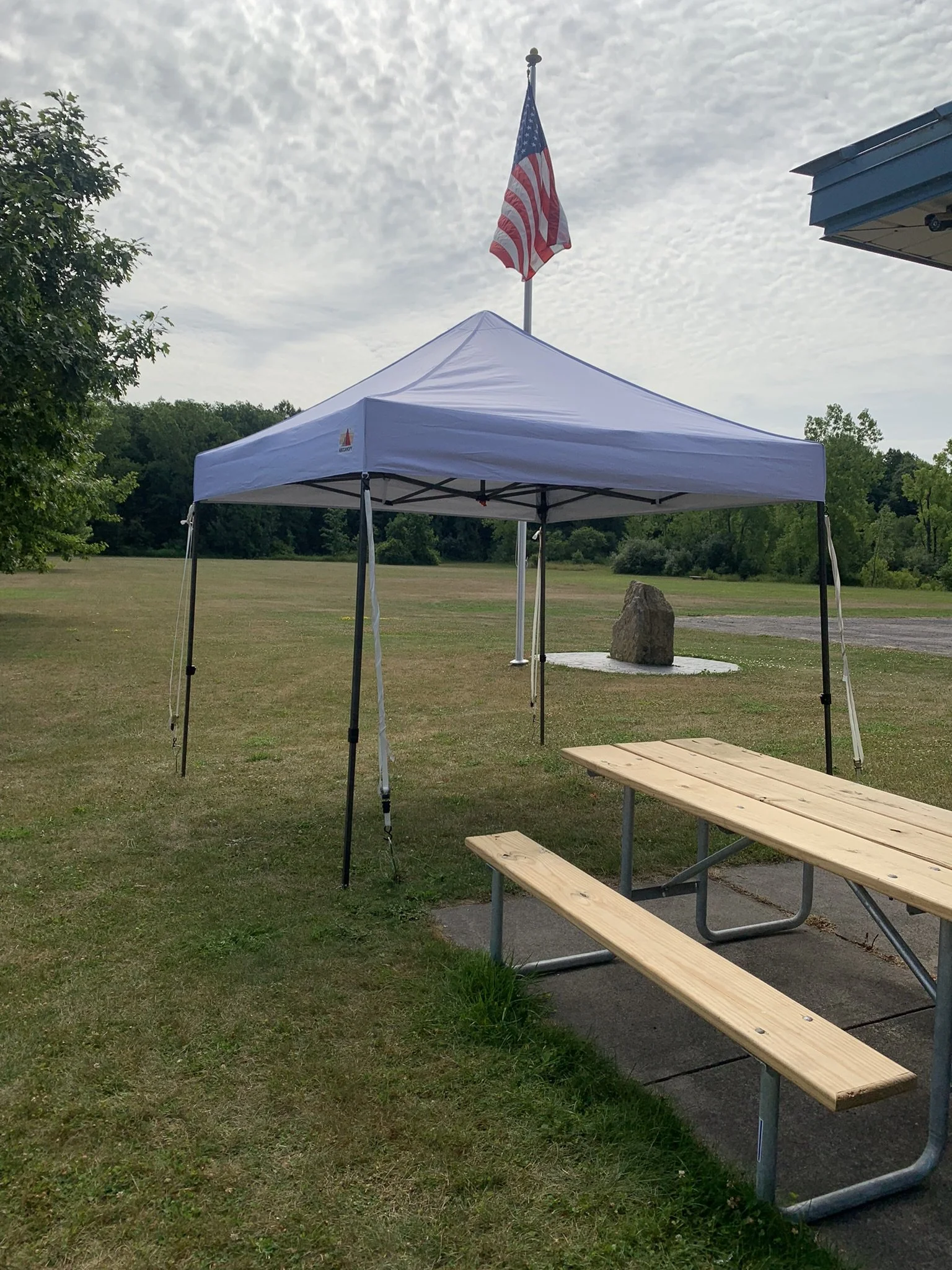 Perfect size tent to keep your food under. 10 x 10 Pop Up Canopy with straight legs provides a true 100 square feet shade. Suitable for parties, picnics or any outdoor events. Fits approximately 20 people standing. Big enough for about 6-10 people to sit under it. Tent must be on grass.